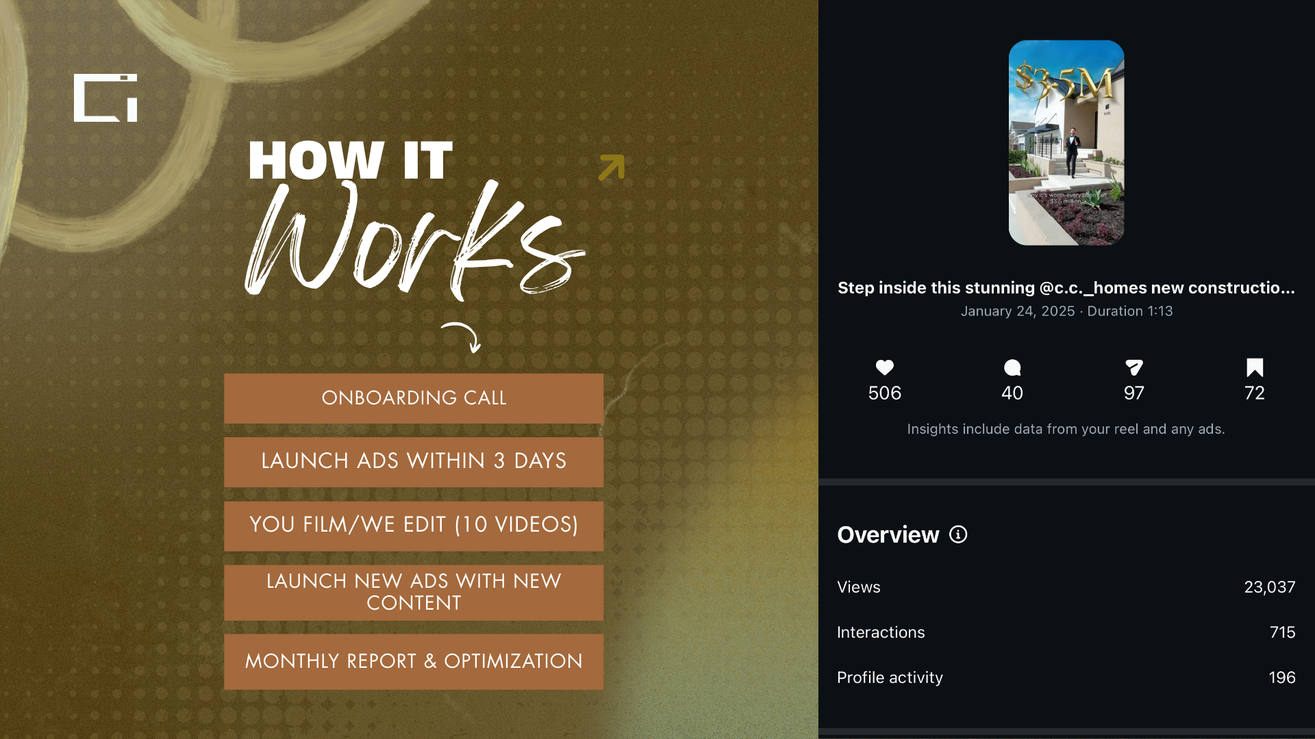 At a high level, we help real estate agents become the go to agent, stream-line content creation, gain more followers, and increase engagement using Instagram and Facebook Ads. We guarantee you will reach 100k people in your market using our strategy.